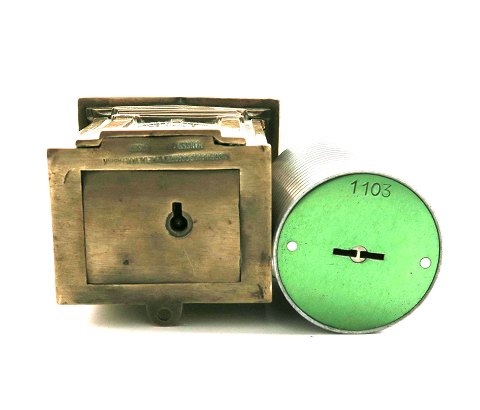 Lot bestående af bygningsformet sparebøsse af messing *6828 Den Danske Landmandsbank - Odd Fellow Ordenens Sparebøsse* samt cylinderformet sparebøsse med indkast lirkesikring *Frederiksberg Sparekasse - Stiftet 1894* H. Henholdsvis 12 cm. og 9 cm. Nøgler mangler. Frederiksberg sparebøsse med ukendt indhold.