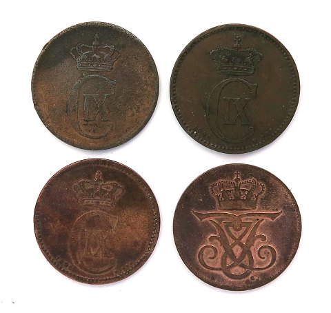 Christian IX 5 øre 18??, -94 og 1906 samt Frederik VIII, 5 øre 1908.