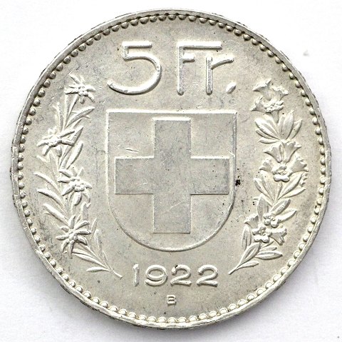 Schweiz, 5 Francs, 1922 B, sølv, 25.00 gr., .900, KM# 37