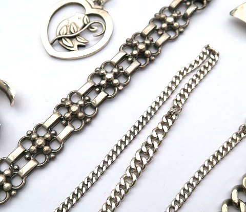 Lot bestående af panser collier i forløb, 2 armlænker af sølv, L. 21 og 20,5 cm., 4 brocher, vedhæng af forgyldt sølv med røgkvarts samt forsølvet lommeurkæde.