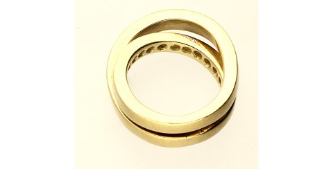 Cross-over ring af 14 kt. guld, prydet med 15 square cut diamanter på række, tilsammen ca. 1,35 ct. Ring Str. 53, samlet vægt ca. 16 gr.