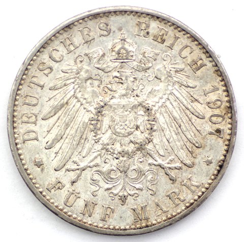Tyskland, Württemberg, Wilhelm II, 5 Mark, 1907 F, sølv
