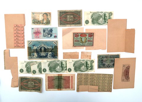Samling bestående af danske rationeringmærker, tyske sedler fra inflationstiden, nødpenge og sedler fra tidligere østlande.