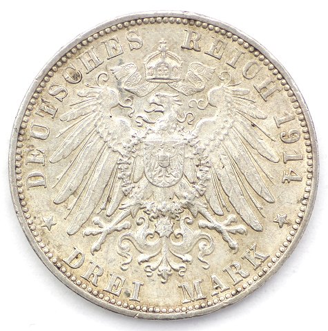 Tyskland, Württemberg, Wilhelm II, 3 Mark, 1914 F, sølv