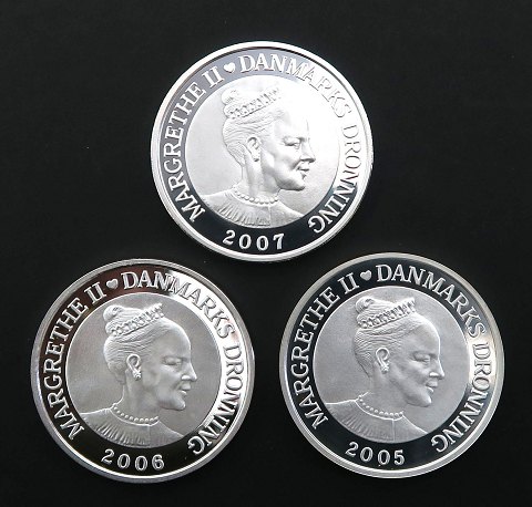 100 kr. finsølv *Isbjørn* præget 2007 - 2009 i anledning af det internationale Polarår, 10 kr. finsølv *Den lille Havfrue* og *Skyggen* præget 2005 og 2006 i anledningen af 200 året for H.C. Andersens fødsel. Originale etuier fra Den Kgl. Mønt medfølger. Hver mønt indeholder 31,1 gram finsølv.