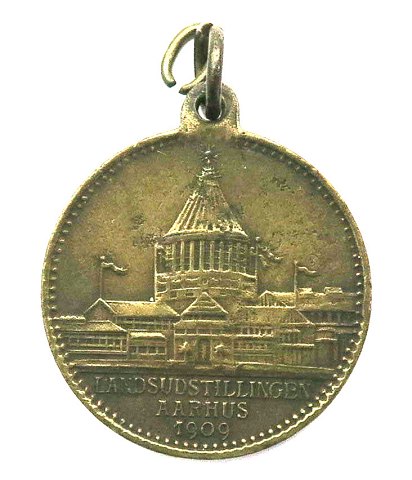 Lot bestående af medalje af messing fra landsudstillingen 1909 i Aarhus, diameter 24 mm., samt 2 aviser, udgivet på dagen for landsudstillingens åbning Demokraten fra den 18. Maj 1909 *Landsudstillingens Aabning* samt Aarhus Stiftstidende 18de Maj 1909 *Dagens Program* (for landsudstillingen).