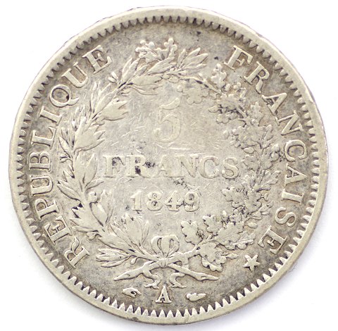 Frankrig, 5 Franc, 1849 A, sølv