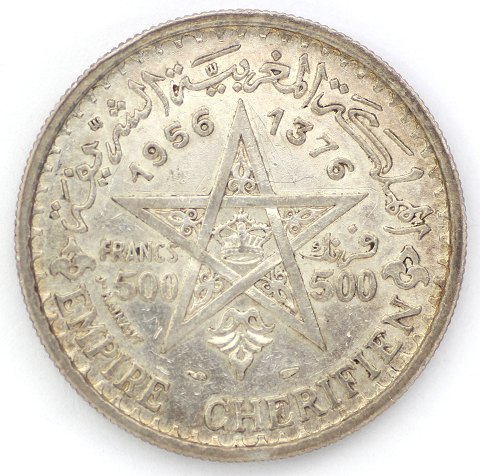 Marokko, Mohammed V, 500 Francs, AH 1376(1956), sølv