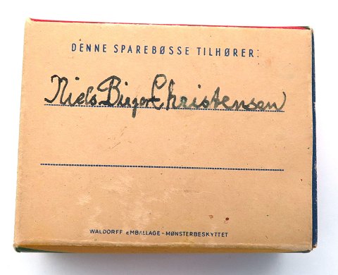 Bikuben, sparebøsse fra 1950'erne af foldet pap med logo tryk