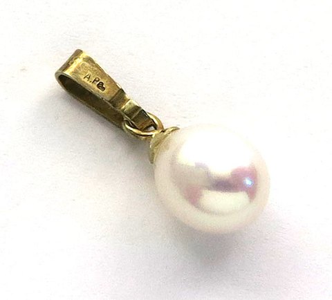Vedhæng af 14 kt. guld med dråbeformet 7 mm. kulturperle, L. med øsken 18 mm.