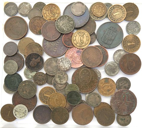 Christian VII, Frederik VI, Christian VIII, Frederik VII og Christian IX, samling Skillngmønter, bestående af 29 sølvmønter og 45 mønter af kobber / bronze.