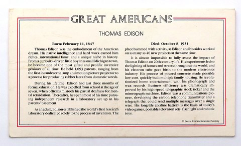 USA, brevkort *Great Americans* 3 Cent lilla Thomas Edison