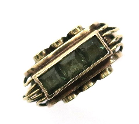 Ring af 8 kt guld med aflang, forhøjet front, prydet med 3 facetslebne, grønne sten. Ring Str. 54, samlet vægt ca. 3,5 gr.