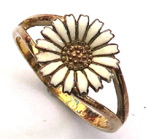 Blomst dekoreret med emaille. Ring Str. 53½, samlet vægt ca. 2 gr.