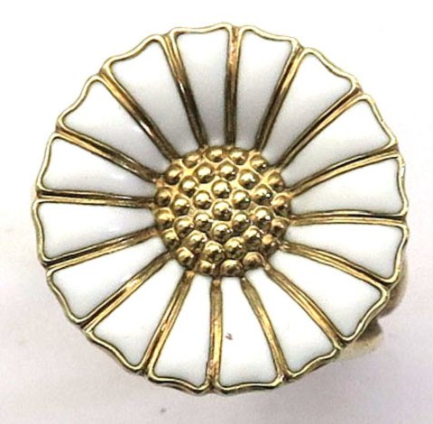 Georg Jensen *Daisy* ring af forgyldt sterling sølv, blomst dekoreret med hvid emaille. Ring Str. 51, samlet vægt ca. 4,5 gr.