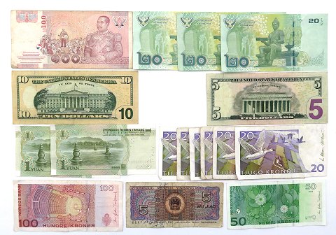 Samling sedler bestående af 160 Bath Thailand, 120 SEK, 150 NKR, 15 US $ samt Kina, 2 Yuan og 5 Wu Jiao.