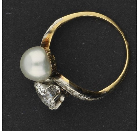 Ring af guld og hvidguld, prydet med circular-cut diamant ca. 1,0ct., flankeret af yderlige 10 diamanter og kulturperle. Samlet vægt ca. 3,5 gr. Ring Str. 51.