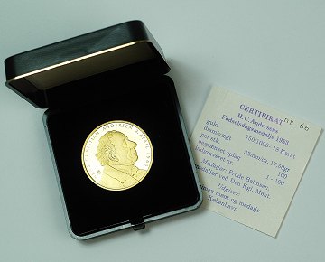 Veludført medaille af 18 kt. guld, præget i anledning af 140-året for digtningen af "Den Grimme Ælling" i 1843. Ø. 33 mm.