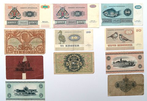 ot bestående af 2x 1 kr. 1914 serie 2897785 og 1 kr. 1921 2L, 5 kr. 1942 G8, 3x 10 kr. 1942 S9, 1974 D3, 1977 B7 samt 2x 100 kr. 1978 F1 og 1988 D6