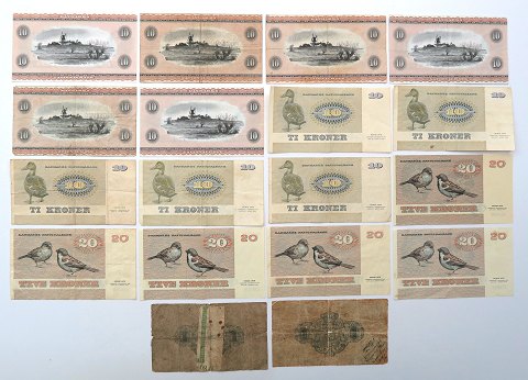 Lot bestående af 2x 1 kr. 1916 serie 600898, 1921 2 H, 6x 10 kr. *Portræt og landskab* 19678 K7, 2x 1970 B5 og A9, 1973 C7, 2x 1974 D0, 5x 10 kr. *Dyreserien* 1977 3x B7 og 2x B4, 5x 20 kr. *Dyreserien* 1980 A5, 1983 C2, 1987 C6, og 2x 1988 c7 og C8