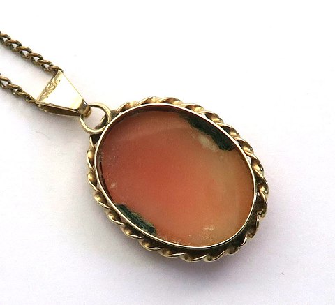 Camé vedhæng i fatning af 14 kt. guld samt forgyldt halskæde, L. 56 cm.