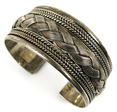 Armring af sterling sølv, prydet med påsatte fletmønstre. Indvendigt mål 60 x 50 mm.