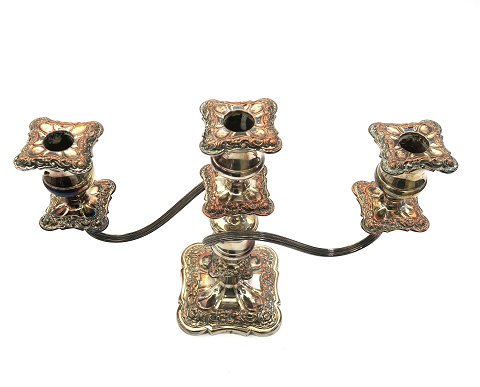 Dekorativ, trearmet lysestage af sølvplet i barokform. Stagen kunne være et godt emne til DR1 udsendelserne *Skattejægerne*, hvor der jo gøres rustne, defekte, bulede eller afskallede emner til hotte indretningsgenstande.