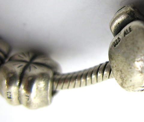 Pandora armlænke, prydet med 10 charms i form af mobiltelefon, svane, roset, flodhest, firekløver, gavepakke, blomst med pink sten samt tre tøndecharms. Lænke L. 18 cm., samlet vægt 49,5 gr.