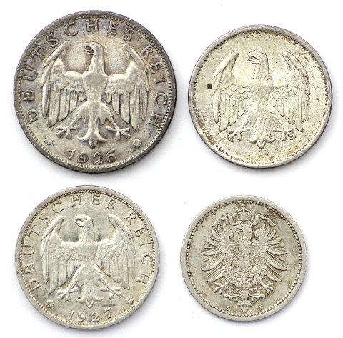 Tyskland, 50 Pfennig 1876 KM# 6, 1 (Reichs)Mark 1924 KM# 45 og 1927 KM# 44 samt 2 Reichsmark 1926 KM# 45(4)
