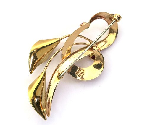 Broche i form af sløjfe af 18 kt. guld, prydet med to facetslebne rubiner og 6½ mm. kulturperler. L. 53 mm.