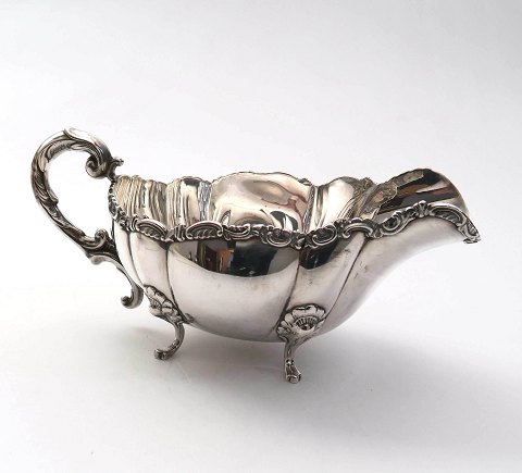 Sauciere på fire ben i barokform af sølv, dekoreret med volutter og bladværk. L. 21,5 cm., vægt ca. 268 gr. Hugo Grühn - København 1947. Front med inskription.