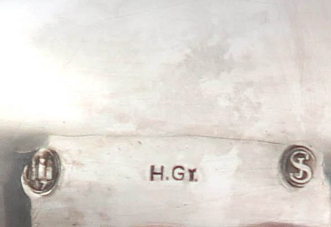 Sauciere på fire ben i barokform af sølv, dekoreret med volutter og bladværk. L. 21,5 cm., vægt ca. 268 gr. Hugo Grühn - København 1947. Front med inskription.