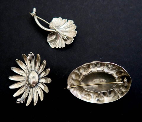 Lot bestående af oval broche af sterling sølv med marmoreret, cabochonformet rav, L. 50 mm., broche af sterling sølv i form af blomst, diameter 45 mm. samt broche af sterling sølv i form af blomst med stilk, L. 45 mm., samlet vægt ca. 32 gr.
