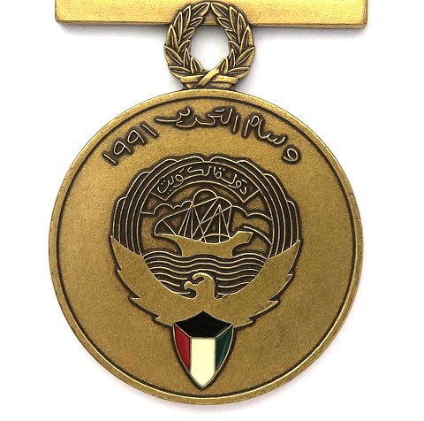 Medaljesæt bestående af medalje og ordensbånd, tildelt af "Goverment of Kuwait" for krigsdeltagelse under befrielsen af Kuwait. Medalje diameter 40 mm., originalæske medfølger.