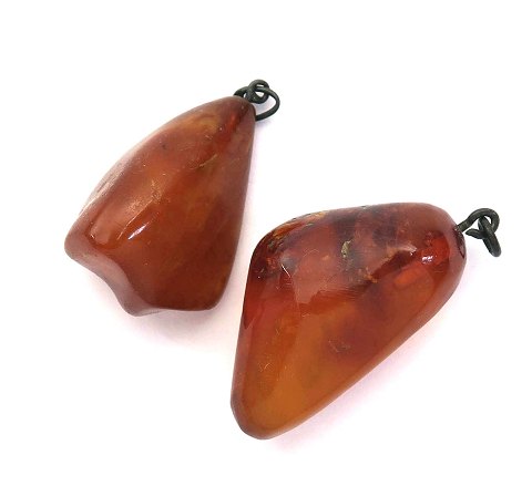 To dråbeformede vedhæng af forarbejdet rav, heraf et med ubestemte indeslutninger. L. 27 og 34 mm., samlet vægt ca. 9 gr.