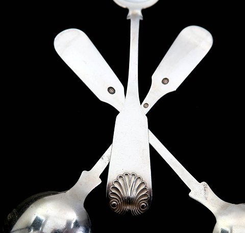 6 Musling spiseskeer af sølv, L. 18. 5 cm., vægt ca. 195 gr. Surel 1915