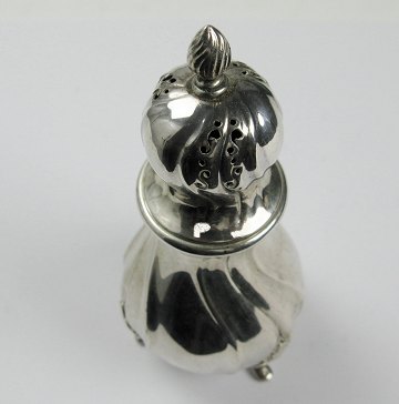 Peberstrøbøsse med skævknækket korpus på tre ben i form af blade. H. 12 cm. Cohr Fredericia 1939. Vægt 62 gr.