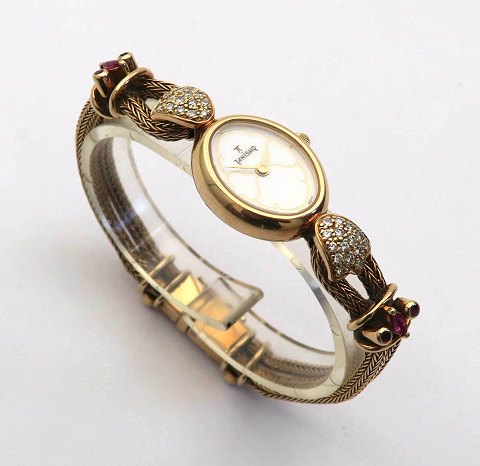 Janishq smykkeur i urkasse og med flettet lænke af 18 kt. guld, prydet med to baguetteslebne rubiner, flankeret af to mindre rubiner samt 28 brillantslebne diamanter, samlet ca. 0,30 ct. Hvid urskive med dekorationsindikation. Quartzværk. Urkasse 18 x 21 mm. Samlet vægt ca. 31 gr.
