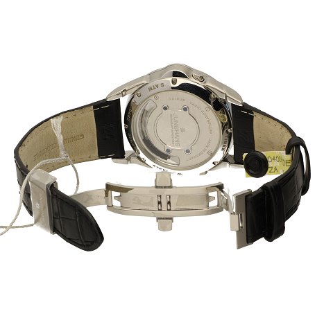Nr. 0482. Urkasse af stål 45 mm diameter. Hvid skive. Sort krokodilleskindsrem. Uret er fabriksnyt og stammer fra ophør - nypris 8.000,-