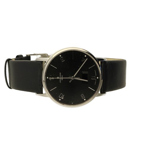 Elegant Junghans herreur - Nr. 9797210. Urkasse af stål Ø: 40 mm. Urskive sort med arabertal/stregindex, centralt placeret sekundviser og datovisning i #6 position. Radiostyret. Sort læderrem.