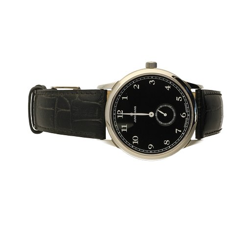 Kasse af stål 41 mm diameter. Sort skive med arabertal/streg index. Sort crocodilleskindsrem. Uret er fabriksnyt og stammer fra ophør