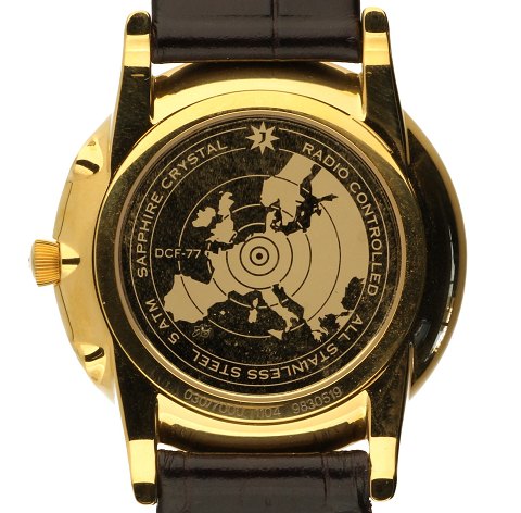 NR. 9830519.Radiostyret. Kasse af forgyldt stål 39 mm diameter. Hvid skive med forgyldt stregindex. Brun læderrem. Uret er fabriksnyt. Nypris 4499,-. Stammer fra ophør.