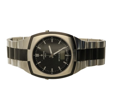 Sporty Junghans herreur. Urkasse og armlænke af mat poleret rustfri stål med sort aftegning og saphir glas, Ø: 38 x 42 mm. Sort skive med stregindex, centreret sekundviser. Radiostyret. Rustfri stål ledlænke med sort midte.