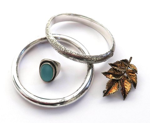 Lot bestående af ciseleret armring af sterling sølv, indvendig 64 x 50 mm., ring af sterling sølv med mat turkisfarvet sten, Str. 52½, Flora Danoca broche af forgyldt sterling sølv samt armring af antageligt massivt sølv, indvendig diameter 63 mm.