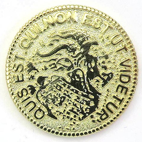 Satanmønt med portræt af Lucifer *Opus Diabolicum DCLXVI* , revers *Quis est qui non est ut videtur* (Hvem er der, at det ikke er som det ser ud. Diameter 31 mm., vægt 11,2 gr.
