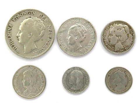 Holland, Wilhelmina, 10 Cent, 25 Cent, ½ Gylden samt 1 Gylden, sølv(6)