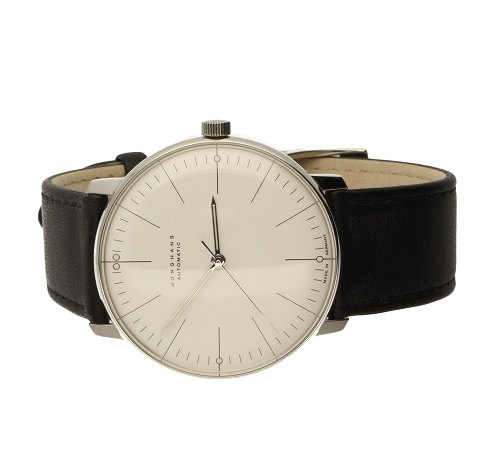 Junghans automatisk herreur i klassisk design af Max Bill. ref. nr. 27.3501 106-5474. Urkasse af rustfri stål, Ø: 38 mm. Hvid urskive med streg index og centralt placeret sekundviser. Refleks i position 12/3/6/9 samt på viserne. Læderrem.