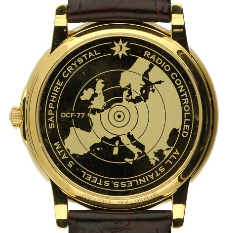030/7953. Kasse af forgyldt stål 41 mm diameter. Hvid skive med arabertal/stregindex. Mørkebrun krokrodilleskindsrem. Uret er fabriksnyt. Nypris 4499,- stammer fra ophør.