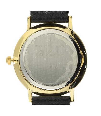 Swiss made quartz, urkasse af forgyldt stål 29 mm diameter, hvid skive med stregindex. Safirglas. Sort læderrem. Fabriksnyt, nypris 6585,- stammer fra ophør.