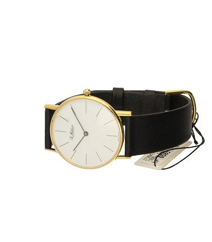 Swiss made quartz, urkasse af forgyldt stål 34 mm diameter, hvid skive med stregindex, safirglas, sort læderrem. Fabriksnyt, nypris 6585,- stammer fra ophør.